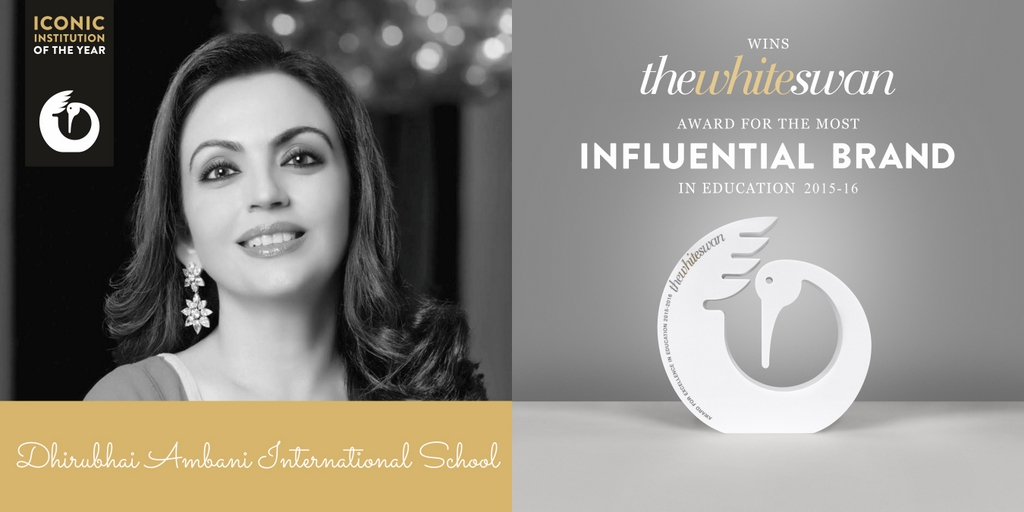 Nita Ambani, Founder and Chairman, Dhirubhai Ambani International School, has been honoured with the country’s finest award in education, the ‘White Swan Award’ for the ‘Most Influential Leader 2015-16’, and Dhirubhai Ambani International School has been awarded with ‘The White Swan Award’ for the ‘Most Influential Brand 2015-16’, at the Taj Lands End, Mumbai on 3rd September, 2016.